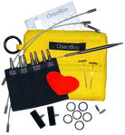 ChiaoGoo's Shorties [L] extension set includes 3" (8 cm) long tips in sizes US9 - 11 (5.5- 8 mm) and cables to make 12" (30 cm) or 14" (36 cm) long circulars. The set comes in a yellow pocket-pouch and includes three of our new SWIV360 cables, stoppers, connectors, stitch markers, a needle gauge, heart shaped rubber gripper and tip sleeve. This set is great for knitting sleeves in the round!